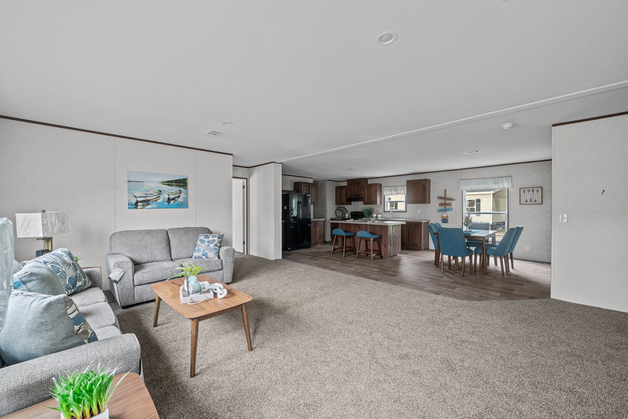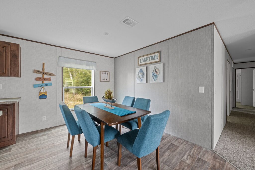 Introducing the Messi, a masterfully designed manufactured home that perfectly marries comfort with style. This expansive dwelling offers five bedrooms and three bathrooms, making it an ideal choice for large families or those who frequently host guests. The kitchen is a culinary enthusiast’s paradise, equipped with an island table, a multitude of drawers for storage, and 30″ overhead cabinets. The kitchen’s modern aesthetic is enhanced by a stainless steel sink with a goose neck faucet, and cabinets with hidden hinges and white lined interiors. The inclusion of a standard black electric range and a 40-gallon water heater ensures that all your cooking and hot water needs are effortlessly catered to.